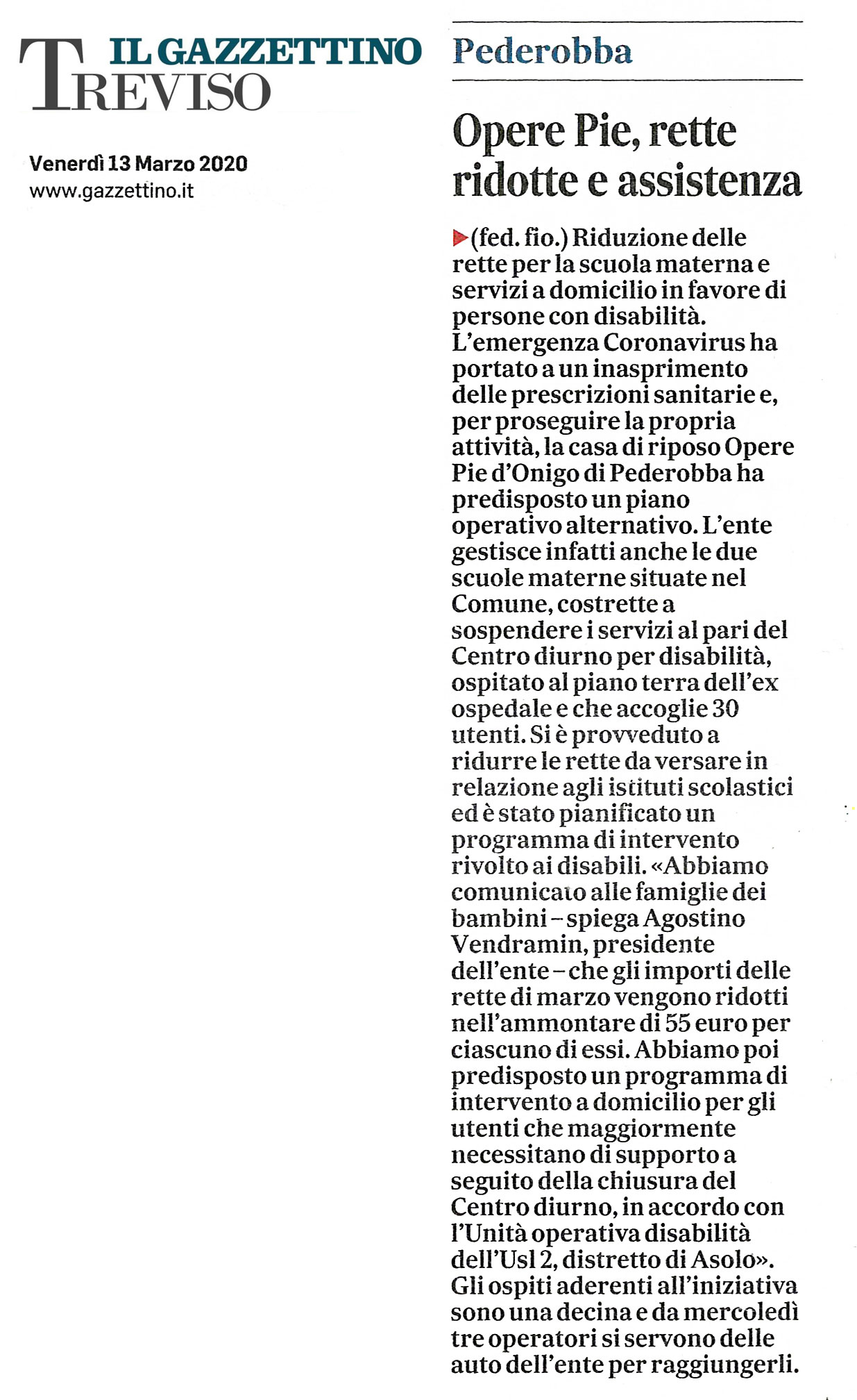 Opere Pie, rette ridotte e assistenza – Il Gazzettino di Treviso, 13/03/2020
