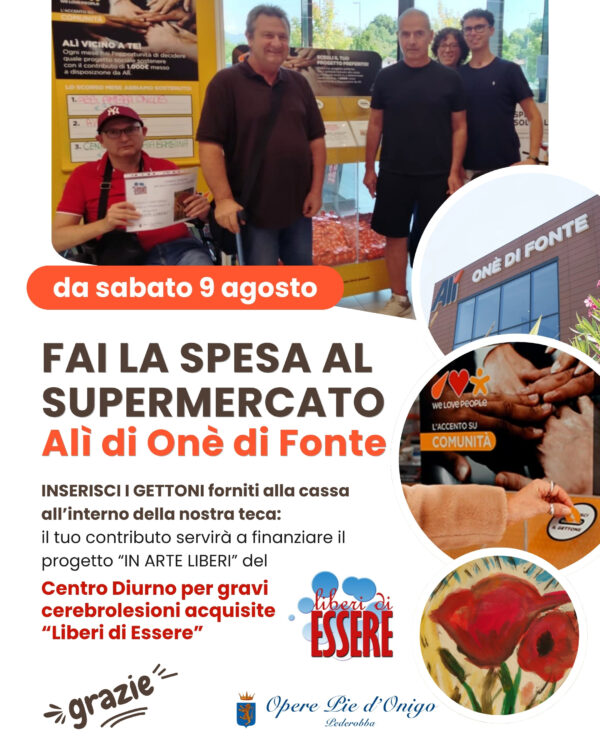 Da sabato 9 agosto, saremo presenti all’interno del Supermercato Alì di Onè di Fonte (Via Roma, 95) per una raccolta fondi che finanzierà diversi progetti artistici che svolgeremo all’interno del Centro Diurno per Adulti “LIBERI DI ESSERE”