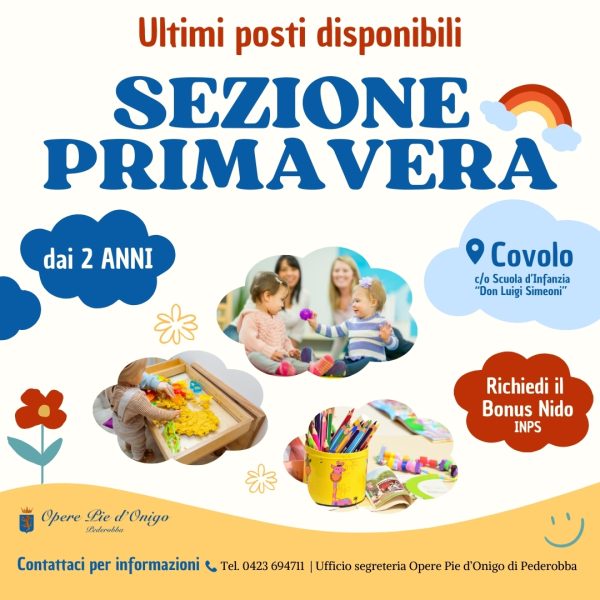 Se sei un genitore di un/a bambino/a di 2 anni, puoi effettuare l’iscrizione alla Sezione Primavera della Scuola d’Infanzia di Covolo di Pederobba (TV), che offre: